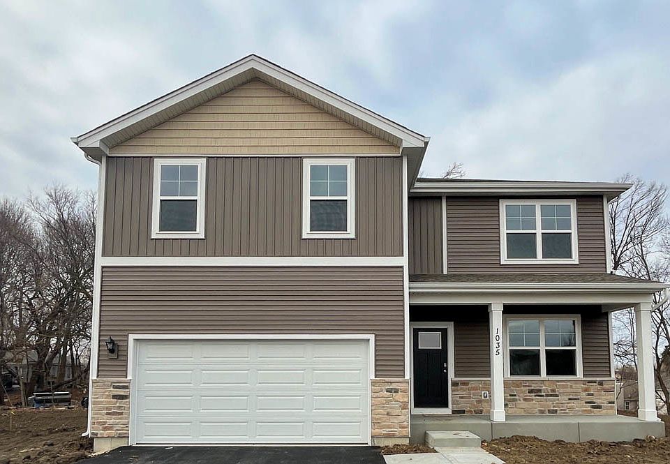 Discover yourself at 1035 Leeward Lane in Pingree Grove, Illinois, a beautiful new home in our Cambridge Lakes community. This home is ready for a winter move-in! This exclusive cul de sac homes are the finishing touch to this already established neighborhood. The Henley plan offers 2,600 square feet of living space, including 4 bedrooms, 2.5 baths, and a loft with 9 foot ceilings and a full lookout basement. Entertaining will be easy in this open-concept kitchen and family room layout with a large kitchen island with an overhang for stools. Additionally, the kitchen features a walk-in pantry, modern stainless-steel appliances, quartz countertops, and easy-to-maintain luxury vinyl plank flooring. More flexible space is waiting upstairs in the 2nd floor loft, offering unlimited potential to suit your needs. Enjoy your private getaway in the primary bedroom with a large walk-in closet and private bath featuring a raised dual bowl vanity, luxury vinyl plank floors, quartz vanity top, large shower with tiled walls, and a linen closet. Convenient walk-in laundry room, 3 additional bedrooms with a full second bath, and a linen closet compete the second floor. Cambridge Lakes is a master planned clubhouse community that includes 11 playgrounds, outdoor pool with kiddie splash areas and a Clubhouse. Clubhouse includes a fitness center and exercise classes, basketball courts, game room, party room, activity rooms with fun stuff planned, soccer field, 5 baseball diamonds and a skateboard park. All Chicago homes include our America's Smart Home Technology, featuring a smart video doorbell, smart Honeywell thermostat, Amazon Echo Pop, smart door lock, Deako smart light switches and more. Exterior photo of actual home, interior photos are of similar home and model home. Actual home built may vary