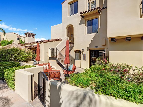 Welcome to Villorrio, an enchanting Tuscan-style luxurious living in the desirable Central Palm Springs. This prestigious gated community offers everything you wish: you OWN the land, centrally located (about 0.5 mile to downtown), walking/biking distance to everything, shopping, groceries, parks, museums, galleries, cafés, trendy bars, fine restaurants, Casino & Spa, golf courses; community pool + 3 spas, fitness center, clubhouse w/kitchen + BBQ, low density, cobblestone streets, well maintained beautiful landscape with a tranquil stream. This upgraded and elegant townhome has the best location: very quiet away from the pool area, plus near the 2 secluded spas located on the East side. 2 En-Suite Bedrooms plus a private & quiet oversized BONUS room/den/3rd BD downstairs (perfect home-office w/a large storage closet) w/its own fireplace, Powder Room, a living room w/fireplace and built-ins, an ample + tranquil South facing patio (ideal for morning coffee overlooking the tree tops), a large balcony off the dining area, stainless steel appliances, granite counters, gas stove, ceiling fans, plantation shutters throughout, incredible mountain Views from several rooms, 2 car garage + guest parking. Surrounded by great jogging/hiking trails. Low HOA includes water, trash. Approximately 1,466 SqFt includes the Bonus Room downstairs.