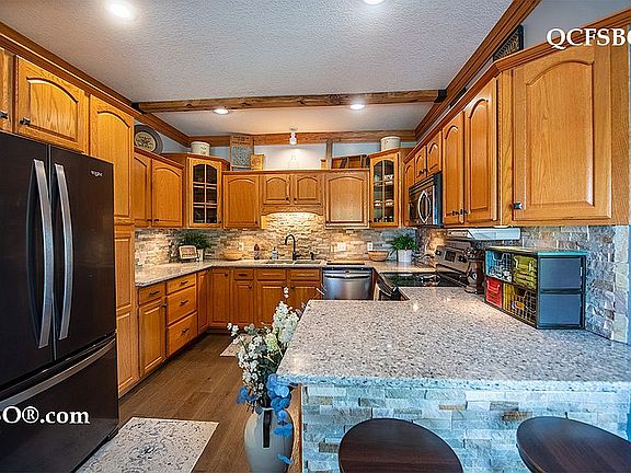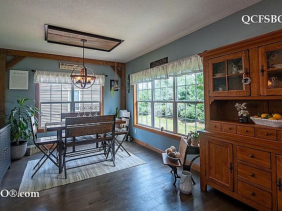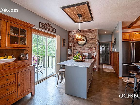 Beautiful custom built one owner home located on a cul-de-sac in the lovely sought after Townsend Farms Addition in Eldridge Iowa, a short walk to all three North Scott Schools. This cape cod style home with walk out basement has over 3,400 square foot of finished living space, and also includes a four car heated garage with in floor radiant heat and custom interior wood finishings. Major improvements to home include new complete Trane HVAC system installed in 2023, gas 50 gallon power vent water heater installed in 2022, vinyl cedar shake siding on front of home installed in 2021. Other home improvements are new quartz Kitchen counter tops, new bathroom quartz counter tops, carpet, hard wood flooring, and ceramic tile flooring. A Large covered front porch greets you as you enter this home, once inside you will see a floor to ceiling brick gas fire place and exposed wood beams in living room. Kitchen and dining area are located in back of home with hardwood flooring, exposed wood beams and large windows to look out over the wooded back yard. A sliding door from kitchen will take to a maintenance free deck area. The master bedroom in this home is located on main floor with attached full bathroom, complete with walk in shower and large soaking tub. A large walk in closet with custom closet organizers complete the master bedroom. The homes laundry room with half bath is located on first floor to make home choirs easy. Upstairs you will find two bedrooms that are both 14’+18’, each bedroom are complete with walk in closets with custom clothes organizers. There is an additional living room located upstairs and office, NO more fighting with kids on what to watch on TV! Upstairs you will also find a large full bath complete with double sink vanity and linen closet. The down stairs consists of a large family room complete with custom Bar area. Also Downstairs is a half bath and Rec area that features a sliding glass door to access large concrete patio complete with outdoor TV and fully finished She Shed complete with TV and refrigerator. Storage in home is easy with huge storage area located in basement. Back yard has a fenced in black chain link fence to keep kids and pets safe and where they need to be, home! Home has mature trees and well maintained landscaping around house.
