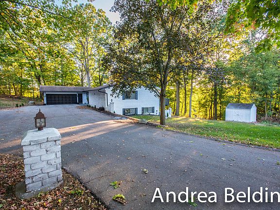 Enjoy breathtaking views from this equally breathtaking over 3,500 sq.ft. sprawling ranch! 1.68 wooded acres - nestled on the edge of town overlooking the beautiful Flat River & 200ft of private river frontage. Take it all in from your private deck that spans the back of the home, or from the stunning interior that boasts 4 large bedrooms, 2 full baths, 2 large brick, double -sided, natural gas fireplaces, gourmet kitchen, 6 sets of sliding doors to let nature in. This is the perfect home to entertain, large gathering spaces up & down in your spacious walkout basement. Superior Construction, so many extras- 6 camera security system, driveway alert system, heated garage, 115 gallon hot water heater, Nest thermostat, whole house intercom & radio, heat lamps in master shower, fenced in back