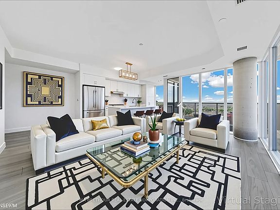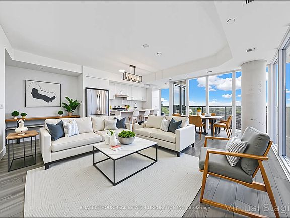 Corner suiteOpen concept livingFloor to ceiling windowsViews of the lakeModern kitchenLarge quartz island