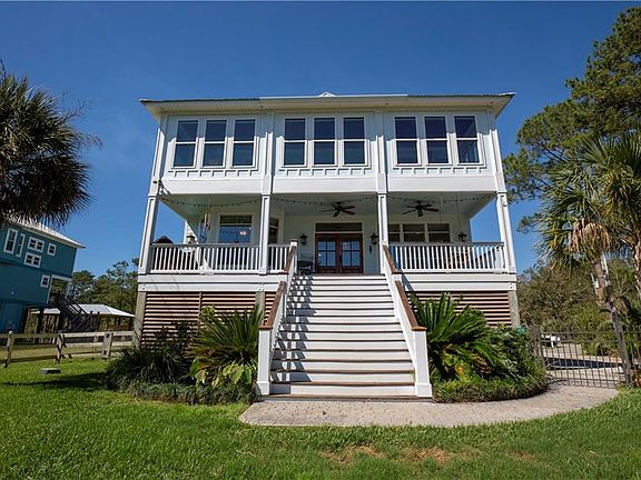 Hidden away on the fringe of Weeks Bay is this stylish waterfront residence with three bedrooms, two and a half baths, a study. The house comes complete with a dry entrance, parking for four vehicles under the home, a crab dock, covered boat house and boat lift, fenced yard and firepit. The entry level floor plan is bright and open flowing into the traditional foyer, updated kitchen and breakfast nook, a large den/family room, private study, and formal dining room. Gorgeous pine flooring on the first floor and upstairs sunroom has been recently refinished. Upstairs are three bedrooms with recently replaced carpet, large laundry room, master bedroom with trayed ceiling and completely remodeled ensuite bath with plate glass oversized shower, separate garden tub and double vanity with granite counters. The second bath has also been remodeled with walk-in shower, tile surround, and granite countertop. Enjoy the full sunroom on the second floor looking out to Weeks Bay with custom shades, wet bar, small refrigerator, and flat panel television. The stair way railings have been updated with decorative iron. The home also offers two separate storage rooms/workshop under the home. Exterior features include lovely landscaping, gravel drive, irrigation system with separate well, termite bait system, fishing lights and cleaning station. Private location with a warm sense of community, and only minutes to shops and restaurants, this home provides all the elements for relaxing, comfortable and easy-care living! Square footage taken from appraisal. All square footage, room and lot dimensions to be verified by buyer.