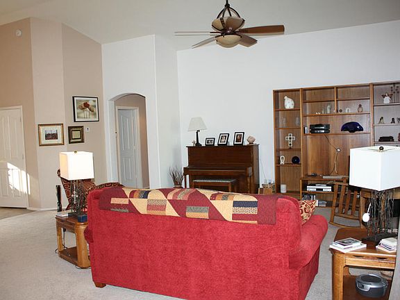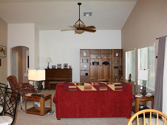 Charming 3 bedroom, 2 bathroom single level home in popular Crismon Creek. No wasted space w/ this open great room floorplan offering vaulted ceilings, custom paint, upgraded carpeting & recessed lighting throughout. Sunny eat-in kitchen, tile flooring, white GE appliance package, pantry & breakfast bar. Spacious master bath w/ separate tub & shower, double sinks & large walk-in closet. Built in cabintes and soft water loop in garage. Backyard features covered patio, view fencing & large grassy play area. Large lot that backs to natural desert wash. Excellent community offers recreational walking trails. Close to freeways and shopping