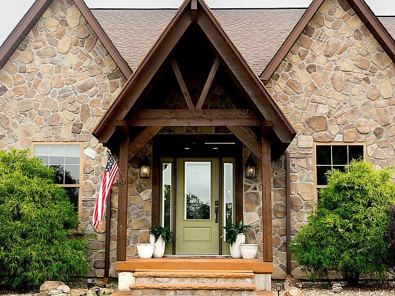 You'll love how the home is tucked back off of the rd, with the most inviting timber + stone front porch!