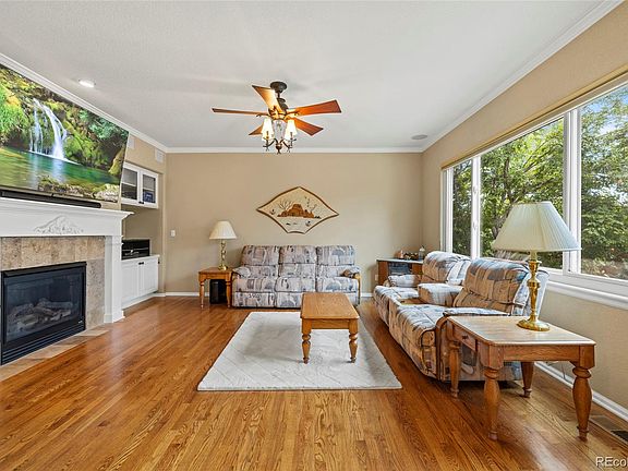 Welcome to the exclusive Meridian Hills II community, where elegance meets comfort. As you step into the foyer, you're greeted by beautiful wood floors and an open, light-filled floor plan that has been meticulously maintained. The spacious kitchen features granite countertops, stainless steel appliances, a center island, and ample cabinetry for all your storage needs. The kitchen flows seamlessly into a large family room with a cozy gas fireplace, perfect for gatherings. The primary bedroom suite offers privacy and new luxury carpet, a lavish 5-piece bath with a jetted tub, and an impressively large walk-in closet with extensive shelving. The main floor also includes a formal dining room, two additional bedrooms, a full bath, an office with beautiful built-in shelves, and a convenient laundry room with extensive cabinetry for storage. The expansive basement, bathed in natural light, is versatile and can serve as an exercise room, game room, or additional storage space. The low-maintenance front and back yards feature rubber mulch and a sprinkler system. In spring, the upper portion of the backyard transforms into a breathtaking flower garden. The fenced backyard offers privacy, a large patio area, grass for pets, and open space views, making it perfect for entertaining. Recent updates include new exterior paint with a 14-year warranty, new Anderson windows, new gutters, and mostly new roof tiles. Conveniently located near I-25 and C-470, this home is nestled in a quiet neighborhood with serene open space views. Don’t miss this extraordinary opportunity to own a piece of Meridian Hills II.