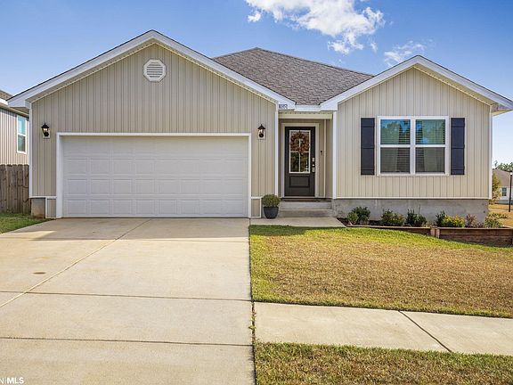 Pride in Ownership is APPARENT as you walk in the front door of this Energy Efficient, GOLD Fortified Cali Open Floor Plan home built in 2021 & located on a Corner lot w/ one of the most MAGNIFICENT Sunset VIEWS around. 4 Bedroom, 2 Bathroom, Granite throughout, Blinds & Window Sills added to all windows, Accent Walls. Kitchen features Stainless Steel Appliances (Kitchen Refrigerator Conveys), tastefully painted island for 2 tone, coffee nook, Updated light fixtures throughout plus White Cabinet w/ added. LVP in the main living area w/ carpet in bedrooms. Living room w/ upgraded ceiling fan, board & batten Decorative wall w/ Custom wood mantel. Open Back porch w/ railings, pavers, 6 ft privacy fence w/ 4 ft gate & 4 motion LED lights. 2 car garage w/ large LED Bar Added for more light, built in workbench, Hooks and painted. Spanish Fort School District, ADT Security, Video Doorbell, Smart Home Technology, located on a quiet street at the end of the neighborhood for privacy. Plus A newly announced YMCA is being built walking distance ways. This home qualifies for special no-lender fee financing. Schedule your showing today before it's sold.