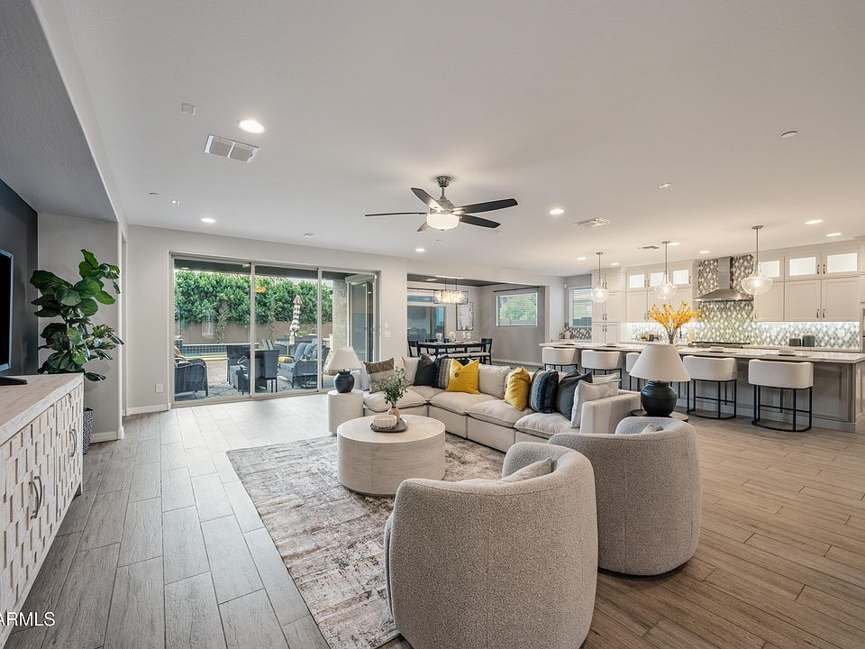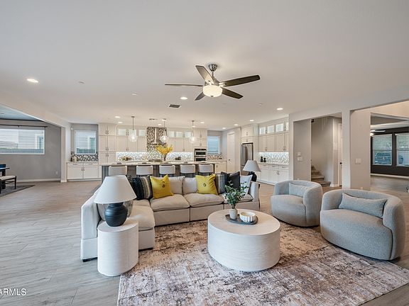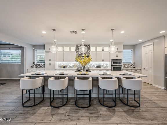 Experience luxury living in this stunning Estates at Eastmark home! Owned solar delivers incredible energy savings, while the Eastmark community offers parks, events, and trails that make every day feel connected. Soaring ceilings and a gourmet kitchen with oversized island, 5-burner gas cooktop, and stainless KitchenAid appliances set the stage for stylish living. A retractable glass wall opens to a private resort-style backyard with an automated pool, spa, fire features, outdoor kitchen with smoker, and multiple entertaining spaces. Upstairs, the spa-like primary retreat is a true sanctuary with double vanities, soaking tub, walk-in shower, and jaw-dropping closet. First-floor guest suite with backyard access, large loft, private den and 4 other bedrooms maximize functional living.