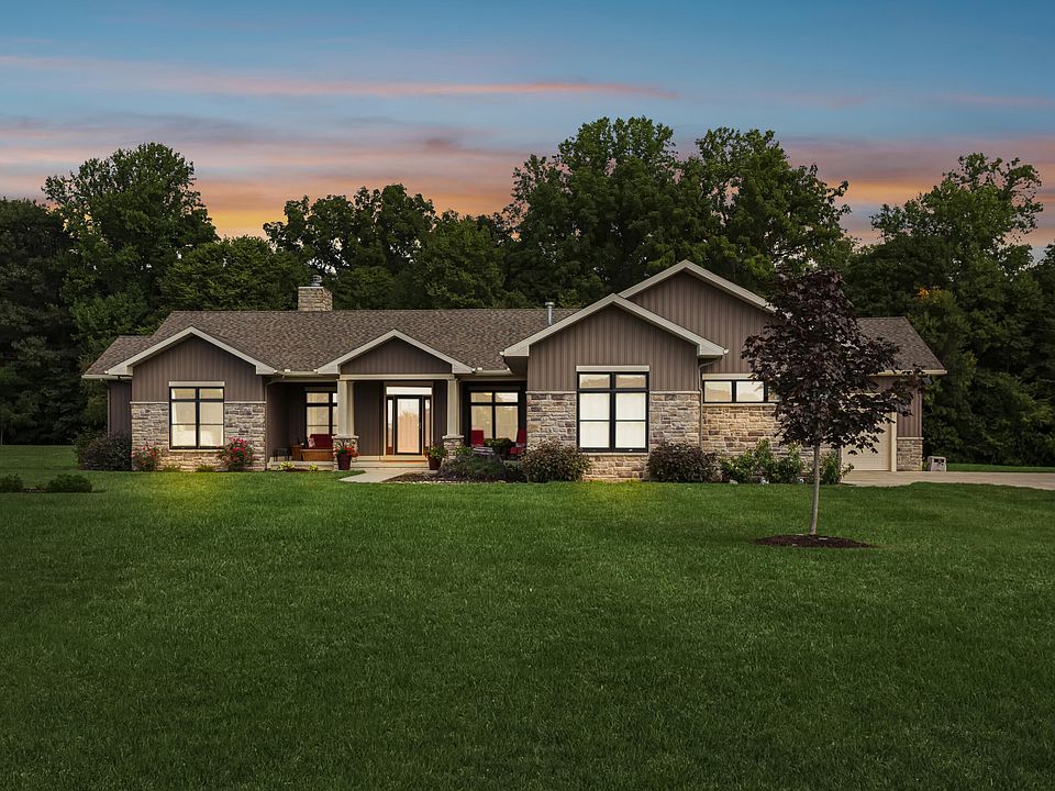 Welcome to this beautifully built home that combines timeless quality with modern comfort. Designed with all your daily needs on one floor, the open floor plan features a stately fireplace in the great room, gorgeous floors, exquisite hickory & maple cabinetry, quartz countertops, and a spacious walk-in pantry. Main floor primary w/soaking tub, walk in shower, and neutral decor throughout. Functionality meets style with a large laundry room, mudroom/landing area, along with a 3+car, heated garage. The full basement, boasting 9-foot ceilings and daylight windows, is ready to be finished to your liking—perfect for a recreation room, home theater, or gym. Step outside and enjoy the covered front patio as well as beautiful backyard patio overlooking gorgeous wooded area. Many upgrades throughout including 400 series windows, 30 year shingles and 500 gallon propane tank. Truly ready to move into! for car and truck enthusiasts! The full basement, with 9-foot ceilings and daylight windows, is insulated, framed, and plumbed for a full bath ready to be finished to your style. Outdoors, enjoy the tranquility from the covered front porch, or watch deer and other wildlife from the backyard patio overlooking a private wooded area. Loaded with upgrades and truly move-in ready, this home is a rare find.