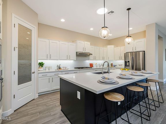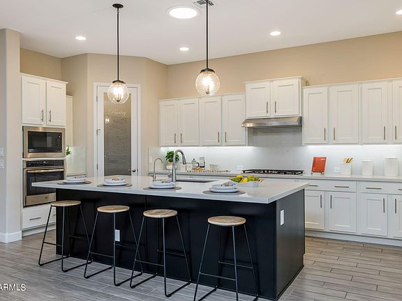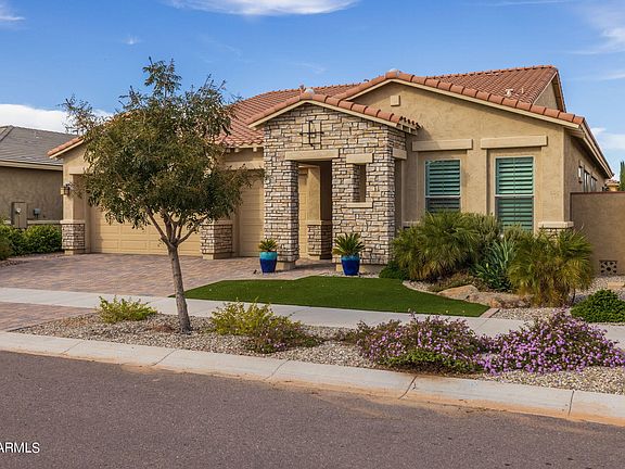 Welcome to the award winning community of Eastmark! This gorgeous home located in the gated community of Harmony is stunning inside and out! Step inside and you will be greeted by an open floor plan, fresh paint throughout the house, new carpet in all the bedrooms, and custom shutters. A couple of features that set this home apart are the surround sound and the solar tubes! This kitchen centric home has it all! White cabinets, gourmet kitchen features, modern cabinet pulls, quartz countertops, and an island with a gorgeous accent color that really brings a pop of color into the home! The primary bedroom is a dream! You will be surrounded with plenty of space and natural light. The primary bath has a large barn door, double sinks, grey quartz countertops(CLICK TO READ MORE) and a walk in shower that is surrounded by stylish tile. The backyard of this home is perfect for entertaining! The salt water, heated pool is new and has a sunning deck. The rest of the backyard was landscaped beautifully with high end finishes, a pergola, and turf! The garage is a 3 car garage with built in cabinets, and a car charger. If this home checks off all of your must haves, make an offer today!