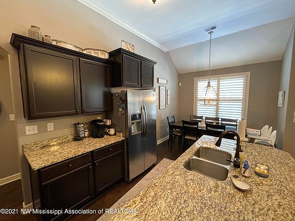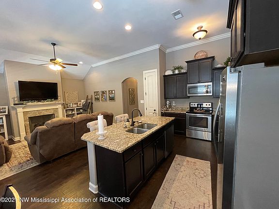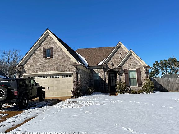 Gorgeous 3 bedroom 2 bath home in Olive Branch featuring an open concept living area and kitchen/dining area with hardwood floors. The Great Room is vaulted and has a beautiful fireplace with gas logs. The kitchen has staggered taller upper cabinets and granite countertops in a rich dark maple stain with large crown & rope molding, soft close doors & drawers and a large center island with a granite overhand for barstools. Stainless steel appliances include a smooth cooktop range, built in microwave, and dishwasher. The dining area is spacious and has a gorgeous light fixture. As an added bonus there are plantation shutters in the Great Room and Dining area as well as the Master Bedroom. The Master Bedroom is spacious and includes a coffered ceiling and a beautiful barn door entry