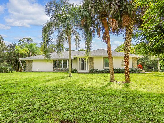 This well-maintained home in Jupiter Farms offers 4 bedrooms, 3 bathrooms, a 2-car garage, and over 3,100 total square feet, all situated on a fully fenced 1.25-acre lot. The layout includes two primary suites on opposite sides of the home, providing added privacy and flexibility. Notable features include hurricane impact doors and windows, a screened-in game pool with jacuzzi, a 2020-installed A/C unit, & new carpet in the bedrooms. The primary bathroom has been recently renovated, and the exterior has been freshly painted. Inside, you'll find LED lighting, tile floors in the main living area, vaulted ceilings, a wet bar, large walk-in closets, and a spacious covered back patio. Additional highlights include exterior motion-sensor security lights, an inside laundry room, new fixtures and fans, and a kitchen equipped with newer stainless-steel appliances, a pantry, and a large breakfast bar overlooking the family room with a cozy fireplace. Multiple sliding glass doors lead to the pool and patio area, making it ideal for entertaining. Conveniently located near Riverbend Park, A-rated elementary school, countless miles of horse trails, Publix, I-95, and the Turnpike, this home combines comfort, style, and accessibility.