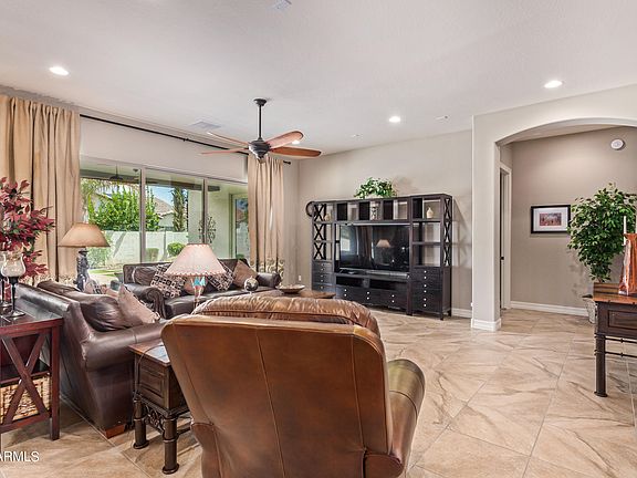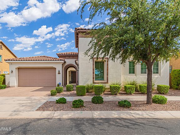 Prepare to be captivated by this stunning single-level 4 bedroom, 2.5 bath home, nestled in the award winning Eastmark community. Positioned on a spacious lot, this upgraded home awaits your arrival. Step through the courtyard into an inviting open floor plan, boasting a Great room with 9+foot ceilings, and custom-made draperies adorning each window, adding an extra touch of elegance. Delight in the splendid chef's kitchen, featuring a gas drop-in cooktop, double oven, granite countertops on the island, and a subway tile backsplash. Relish in the luxury of the oversized primary suite, complete with a spacious sitting area and private access to the back patio. Indulge in the spa-like bathroom, featuring a Jacuzzi soaking tub to retreat and a walk-in snail-tiled shower with a pulse shower head, offering a variety of pulsating water flows. Generously sized, the three additional bedrooms cater to family, guests, or the perfect home office. This meticulously maintained home exudes a charm that stands out from the rest. Prepare to be amazed as you slide open the 5-panel glass door, revealing a serene patio retreat enveloped by orange and lemon trees. With low-maintenance artificial turf and a custom fire pit and waterfall, you can embrace the Arizona weather in absolute comfort. Come and claim this as your personal oasis! The neutral colors offer the canvas you need to make it truly yours. Don't hesitate - seize this opportunity now! Time is of the essence!
