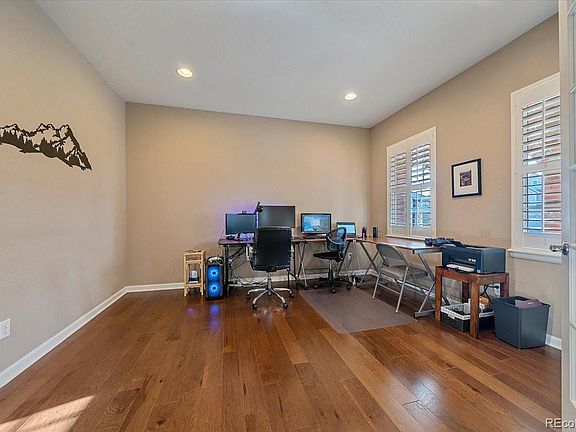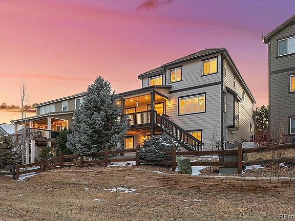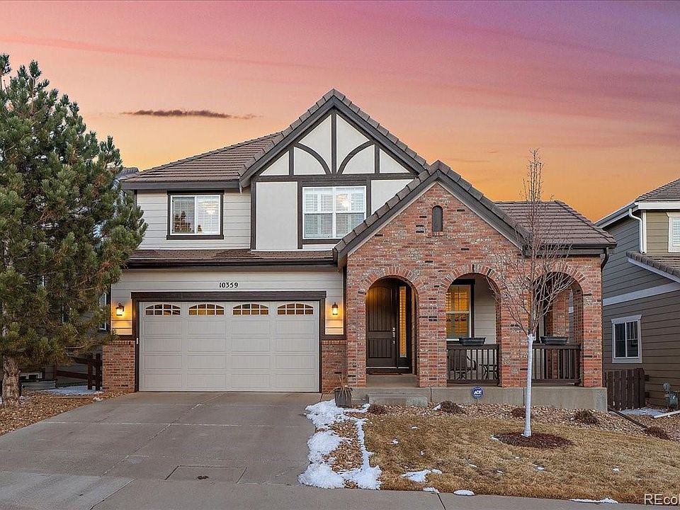 A stunning two story walkout home in the highly desired Meridian neighborhood, this Tudor inspired home features 6 bedrooms, 4 bathrooms and nearly 3,900 finished square feet. Meticulously designed and maintained, the pride of homeownership radiates from every level. This home features a formal dining room, butler's pantry, open concept kitchen, eat-in space and family room with fireplace and access to a spacious deck with stairs descending to a lovely landscaped backyard. A spacious primary suite with five piece bath, French door entry and expansive walk-in closet, three additional bedrooms, full bathroom and cozy landing ideal for a reading nook complete the upper level. The lower level is an entertainer's delight with spacious family and recreation room, wet bar, pool table, 5th bedroom, 3/4 bathroom and a 6th bedroom or workout room with glass French doors. Incredible location 1 block from the community park, playground and pool. In addition this home is located a short commute away from The Denver Tech Center, Parker and all of it's amenities, and DIA. Additional home features include: cul-de-sac location, main floor office/den with French doors, plantation shutters, finished garage with epoxy flooring, extra storage options, backs to green belt and a lovely covered back deck with recessed lighting.