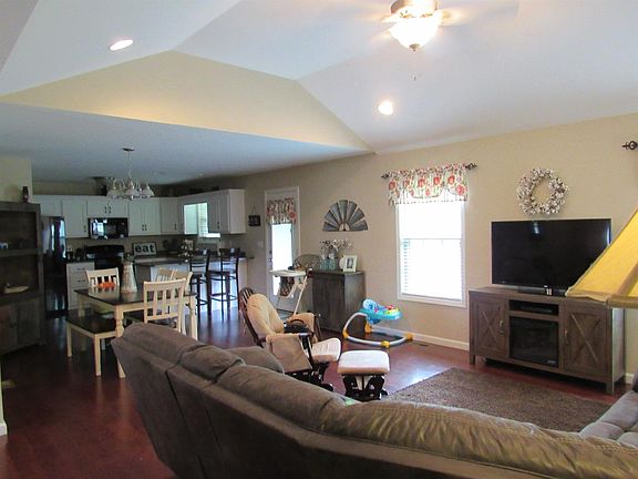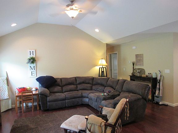 A midsize, 3 bedroom, 2 bath home of approximately 1390 square feet features: open concept living, a master suite on ground level, pantry and utility convenient to kitchen and garage. Home is well kept with an open concept floor plan and vaulted ceiling in living area with recessed lighting and has a close proximity to I75 and the amenities of Berea including shopping, dining, and employment. This home is at the end of street and backs up to the woods adding privacy and quiet atmosphere. The community HOA is based on a yearly rate of $125 and this provides for sidewalks, curbs, streetlamps, fire hydrants, gated access and snow removal on the streets. Sidewalks,curbs, lighting,reduced speed limits and gated access provide for safe walking paths and a fitness center is located within walking distance across the road from the entrance to Eagle Point Estates.
