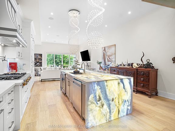 Calling all Blue Chip Tenants! Set in one of Mississauga's most sought-after and evolving neighbourhoods, 1036 Enola Avenue isn't just a home, it's a daily escape into luxury and modern living. Just minutes from the upcoming Lakeview Village, Port Credit, and Lake Ontario's shoreline, this stunning residence blends sophistication with everyday functionality, offering over 3,600 sq ft of meticulously finished space. With no detail overlooked, this custom showpiece features 11-ft ceilings on the main level, open-tread staircases, and sleek glass railings that create effortless flow and sophistication. At the heart of the home, the chef's kitchen is outfitted with built-in premium appliances, custom hood, and a showstopping illuminated imported marble island. Pot lights, wide-plank flooring, and integrated speakers enhance the modern aesthetic. The adjoining living area is anchored by a sleek gas fireplace and full-length windows framing tranquil, green views. The spa-inspired primary suite offers a sculptural soaking tub, dual rainfall shower towers, and a custom walk-in closet. Additional bedrooms are generously sized with designer finishes, and a skylight above the upper hallway floods the space with natural light. The fully finished lower level elevates the living experience with a glass-enclosed wine cellar, private sauna, and a separate walk-up entrance, ideal for extended family or a home office. A modern bathroom with double vessel sinks completes the space. Each level features built-in iPad screens connected to the door camera system for secure, voice-enabled entry, while integrated speakers throughout the home are powered by a premium Onkyo audio system perfect for immersive, whole-home sound. Outside, a fenced yard and deck create a private setting for summer entertaining. Just steps from lakefront parks, golf, top-tier schools, and with easy access to the QEW, Highway 403, and the GO Station, this is luxury living in Lakeview at its finest.