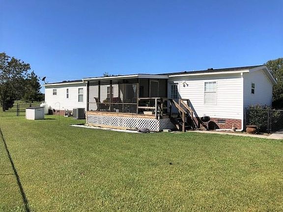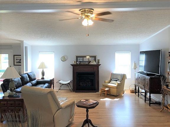 Waterfront Detitled Horton DW Mobile Home on large corner lot. This well maintained home features a large open floor plan with cathedral ceiling and pecan laminate hardwood floors throughout. Home includes a large kitchen with island and lots of cabinets, master bedroom with walk-in closet and spacious bath with double vanity and floor to ceiling cabinets, two guest bedrooms, guest bath, laundry room, screened porch with beautiful water view; concrete drive and sidewalks, partially fenced yard for pets, two storage sheds and 200+ feet of waterfront. Marginal lease is $182/yr through October 28, 2057. You will have lots of room both inside and out with this lovely property. Call now to schedule your showing!