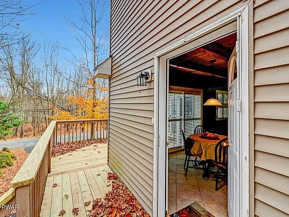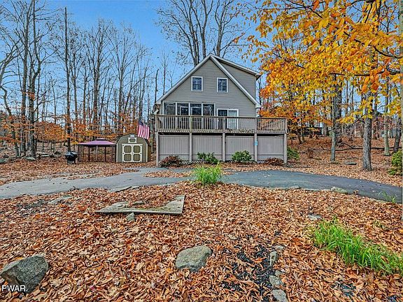 Come see this 3 bedroom, 2 bath Chalet in amenity filled community of Wallenpaupack Lake Estates. First floor offers open concept kitchen, dining and living area with one bedroom and a combination bathroom/laundry area. The second floor has a large primary bedroom with a primary bathroom and an additional bedroom. The basement is partially finished with so much potential with future living space. Circular paved driveway provided plenty of parking area. Recently replaced roof, gutters and deck boards adds additional value to this already great house. The community offers 2 great outdoor pools, interior lakes for swimming and kayaking, indoor pool, gym, sauna, and access the Big Lake (Lake Wallenpaupack) which provides an array of water activities. House is being sold with most of the contents.