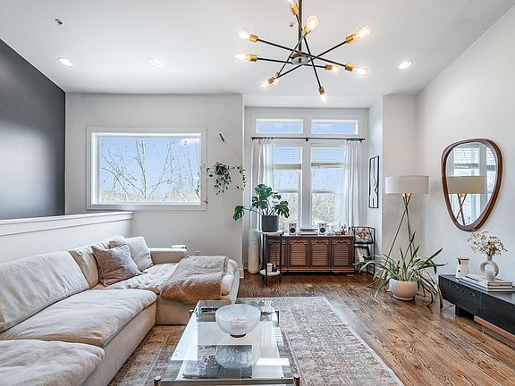 **Price Adjustment!! AND Seller is offering $5,000 toward buyers' closing costs or rate buy down!** Lovely open-layout home with tons of natural light! Concrete and carpet flooring on entry level, real hardwood and 10' ceilings on primary level. Kitchen features quartz counters, glass backsplash, large pantry, all stainless appliances remain- including fridge. Primary bath features double vanity, frameless shower and large closet. Washer and dryer remain. Center unit with attached carport, and community green space. Updated light fixtures and paint make this a modern showcase!