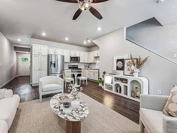 Welcome to Oak Circle. This light and bright townhome offers the comfort of a suburban home with the lock and leave convenience of urban living. The main floor welcomes you with a huge open design living room, eat in kitchen space and modern kitchen, and a large powder room with a great flow for entertaining. The laminate wood floors, huge windows and both east and west entries allows the natural light to bathe the space, while the ample recessed lighting and chandelier offer a warm glow in the evening. The kitchen is a true delight with granite counters and subway tile backsplash, stainless steel appliances and newly refinished cabinets with updated high end hardware. The second floor hosts 2 private bedrooms, 2 en-suite bathrooms, and laundry room. The primary suite offers a walk in closet with built-in shelving, a massive west facing bay window that fills the room with natural light and offers a cozy place to relax and watch a Colorado sunset. The large primary bathroom holds dual sinks and a walk in shower. Down the hall past the double door laundry room, the second bedroom is equally as large and private with abundant closet space and large en-suite bathroom. Fresh paint throughout the home and an on trend neutral pallet make this home feel luxurious and move in ready. Beyond the comforts of this home is the convenience of its location. Just .2 miles from the RTD light rail, you’re now a 5 min walk to exploring the city by train, or cutting your work commute in half! Store your car in your 1 car attached garage while you bike the miles of trails just west of the home or visit Sunset Park, a 21-acre park/open space with basketball courts, trails, and a playground. Guests can park in your driveway or use the overflow parking lot a few steps away. With all the conveniences of urban living and comforts of a suburban neighborhood this dreamy Lakewood townhome can’t be beat!
