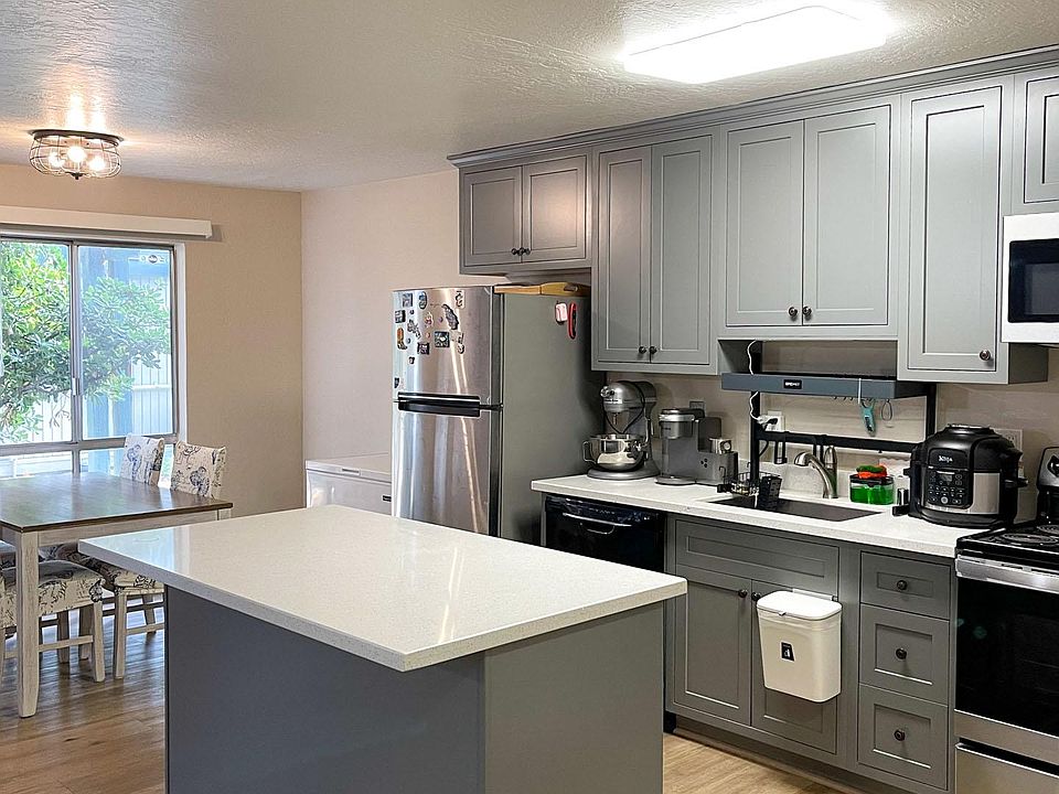 This condo has been beautifully remodeled including an open kitchen with large island quartz counters with newer cabinets and stainless steel appliances in the kitchen. Luxury Vinyl Plank floors throughout and designer colors for the walls. This unit is on the first floor and has an open concept from the kitchen, dining space to living room area. Making it a great space for entertaining. It has a large bedroom that connects to the bathroom. Convenient Jack and Jill bathrooms. The extended patio gives you the space to create your own oasis and enjoy the sound of the water. Also, this condo has a cozy private patio. 1 car carport and available street parking. Convenient and easy access to Costco, shopping, BART, schools and freeways. Community swim pool. One included parking stall. Water and trash included with rent. No smoking. No pets.