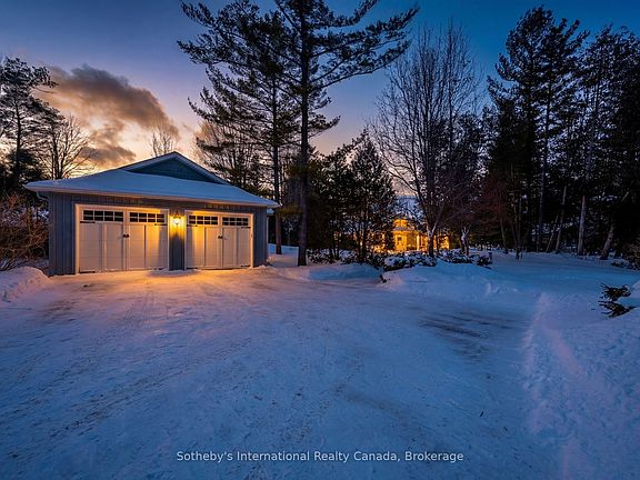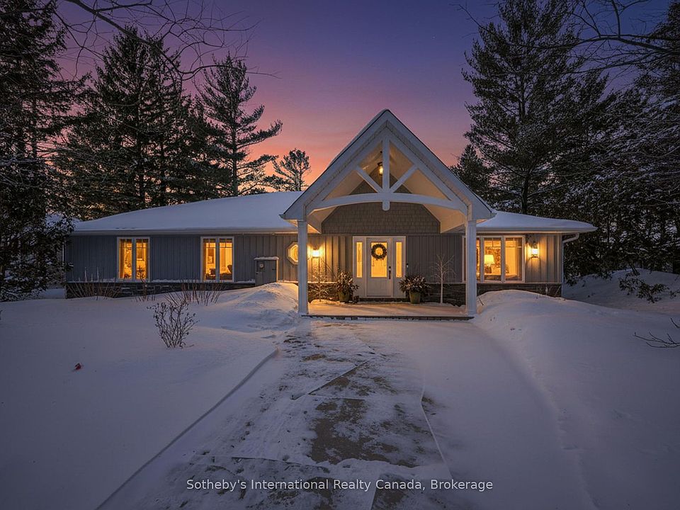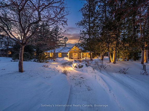Set along the iconic sandy shoreline of Wasaga Beach with immediate beach access, enhanced by the privacy of a quiet sandy road, this custom bungalow offers a rare blend of refined craftsmanship and natural beauty with panoramic views across Georgian Bay to Blue Mountain. Spectacular sunsets paint the sky creating breathtaking scenes in every season. Professionally landscaped grounds span over 1/2 an acre and are framed by mature trees, impressive limestone boulders and meandering walkways through perennial gardens creating a sanctuary that feels natural but refined. This one-floor residence of over 2,800 square feet is thoughtfully designed for effortless living and entertaining. Throughout the home, sunlight streams through oversized casement windows. The open-concept living and dining areas, enhanced by walnut flooring and a vaulted ceiling, are anchored by a striking dual-aspect marble-clad gas fireplace. The expansive gourmet kitchen features granite countertops, an oversized double sink, full-height cabinetry with under-cabinet lighting, a generous pantry and premium appliances including a BlueStar six-burner gas range and Miele fridge/freezer. The two-tiered prep/entertainment island provides seating for five or more. The primary suite is a private retreat that features bay views, access to a secluded deck, a walk-in closet with window, a spa-inspired ensuite with heated floors, granite counters and an oversized marble-tiled shower with granite bench, rainfall showerhead and body jets. Three additional large bedrooms and two three-piece bathrooms provide comfort for family or guests. Outdoor living is enhanced by an expansive lounging and dining deck offering breathtaking lake and stunning sunset vistas. An oversized detached two-car garage and large driveway provide ample parking. This beautiful and unique home ensures tranquil and pleasurable living immersed in the beauty of each season.