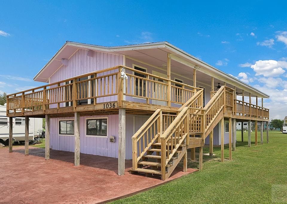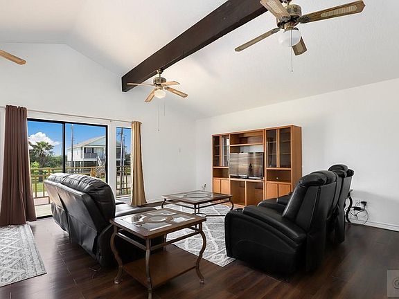 Motivated seller offering a furnished 3 bedroom, 2 bath Crystal Beach home! The inviting living room with soaring vaulted beamed ceiling and balcony is filled with natural light. The kitchen features appliances less than a year old. The primary bedroom boasts an ensuite bath, elevating king size bed, and balcony. Spacious second bedrooms with a queen bed and 2 twins provide versatility for guests. The third bedroom can easily be used as a cozy den or home office. Ample storage throughout. Recent updates include concrete driveway, a tankless water heater, air fry stove, refrigerator, roof, deck on three sides, and supports. Great outdoor space to enjoy! Don't miss the laundry room, storage, and space for additional living area or garage below on the first level. Here's your chance at this rare gem, make an offer today! 3D tour is available online.