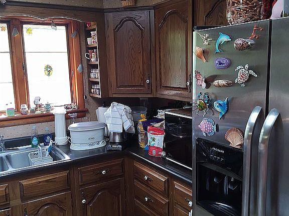 Bi-level built in side of hill with circular driveway. 3 car garage Lower level finished 2 Limestone firepl aces Oak wood floors main level Living room has vaulted ceilings Waterfront property, built by Schilling Brothers.