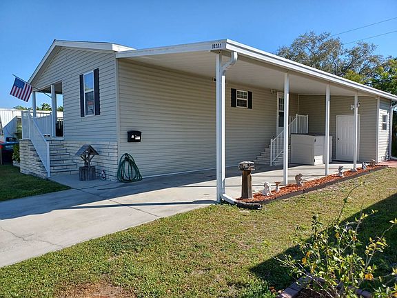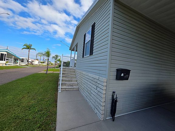 Looking for peace of mind and durability? This 2014 home was thoughtfully designed to stand strong, complete with a brand-new roof and an elevated central HVAC system. From the moment you arrive, the marbled concrete steps and cozy covered front porch set the tone for a welcoming retreat. Inside, you'll find an open-concept floor plan with soaring 10-foot cathedral ceilings and luxury vinyl flooring throughout. The kitchen shines with ample cabinetry, beautiful tile accents, recessed lighting, and convenient access to the indoor laundry room featuring shelving and built-in custom pantry storage. A split-bedroom design ensures privacy, with each bedroom located on opposite sides of the home. The primary suite easily fits a king-sized bed and offers a walk-in closet plus a spa-like en-suite bath with dual counters, abundant cabinetry, and a spacious walk-in shower with stability bar. The guest bedroom is generously sized, fitting a queen bed with ease, and has excellent closet space. The main bathroom includes an extended vanity, medicine cabinet storage, and a shower/tub combo. Outdoors, enjoy the long covered carport with an oversized storage shed for all your tools and hobbies. This home is nestled in a vibrant 55+ community with fantastic amenities: a large heated swimming pool overlooking the lake, relaxing spa, shuffleboard courts, horseshoe pits, and a clubhouse currently being fully updated to host countless resident events. A fitness center is also coming soon! Don't miss your chance to own this beautifully updated, move-in-ready home that blends comfort, convenience, and community living.