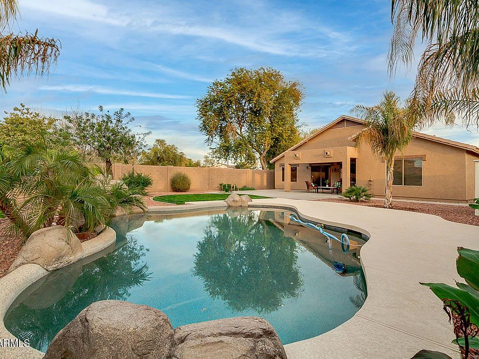 Beautiful property in Southeast Mesa at Crismon Creek! This fantastic home offers a huge 2.5 car garage with epoxy floors, RV gate, water softener and new AC installed in 2020. Enjoy entertaining in this amazing design! The Interior boasts an open floor plan with tile flooring in traffic areas. The kitchen features upgraded stainless steel appliances, island w/breakfast bar, and RO unit. Master suite has designer paint, carpet, a full ensuite w/dual vanity, soaking tub, updated shower and spacious walk-in closet. The fabulous backyard is a complete dream with covered patio, tropical vegetation, lush grass, pebble tech pool, waterfall grotto and generous cool decking for sunbathing! As an added bonus, this house sits on a huge lot right next to a quiet neighborhood park!