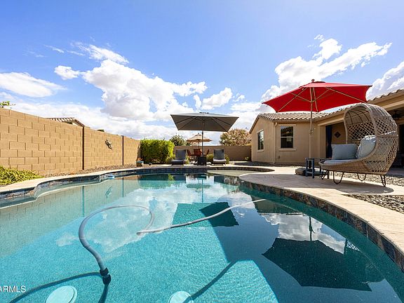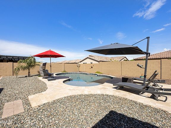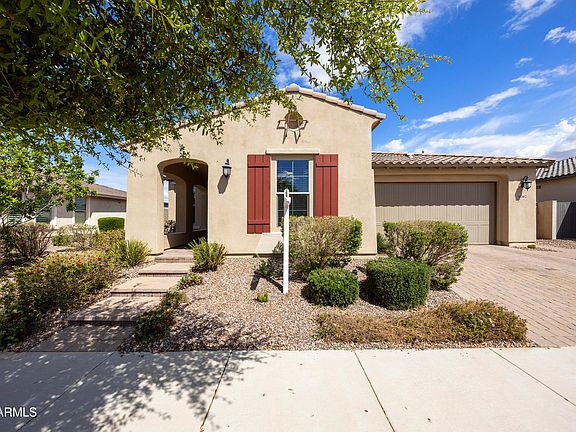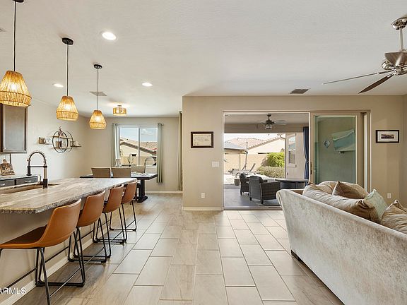 The London plan with 2 bd/2 bath, offers an open & versatile floor plan. The great room features a 12' multi-slider door, leading to an extended covered patio & expansive paver patios, creating seamless indoor-outdoor living spaces. The well-appointed kitchen boasts staggered cabinets, Fantasy brown leather granite countertops, an island with seating, decorative pendant lights, a walk-in pantry, dble wall ovens with touchscreen controls along with a gas cooktop. 12x24'' tile flooring flows through the house in all the walkways, wet areas & great room. The primary bedrm en-suite provides a raised vanity with dble sinks, W-I shower with bench, private water closet & a W-I closet with organizer. The 2nd bdrm shares the 2nd bath, the den has dble doors to allow for a workspace or a 3rd bdrm. The flex rm is open & could be utilized as a dining rm or additional living space. The separate laundry rm includes convenient built-in cabinets. The oversized, premium lot measures 9,818 square feet, with a 22' wide by 20' deep garage with additional overhead storage along with a service door & water softener. The meticulously maintained backyard features a sparkling pool with a travertine tile surround and a baja step, all built by Caribbean Pools. This home is a must see!