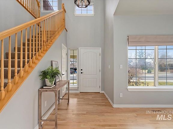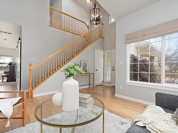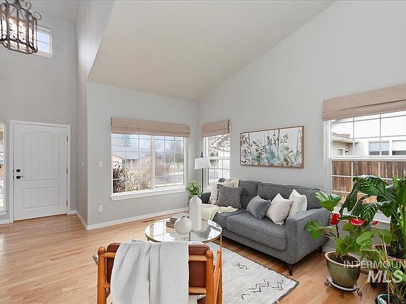 Sunlight pours into this stunning home, creating an inviting atmosphere from the moment you step inside. The open-concept living space is airy & welcoming, with soaring ceilings that connect to the upstairs & flood the home with sunlight. The kitchen is both stylish & functional, boasting granite counters, a breakfast bar, tiled backsplash & a sunny window overlooking the backyard. The adjacent family room offers picturesque backyard views, a cozy brick fireplace & plenty of space to gather & unwind. Upstairs, the primary suite features vaulted ceilings & an ensuite bath with dual vanities & a walk-in shower. Two additional bedrooms are generously sized & share a convenient Jack & Jill bath. Step outside to a park-like backyard with raised planter boxes, a spacious deck & a paved area which can be used as a second patio or store your RV. Located near Eagle Bike Park & the foothills, this Eagle Springs home offers a pool, clubhouse, tennis/pickleball courts, parks & access to the Ridge to Rivers trail system!