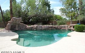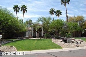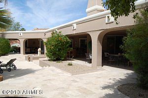 UNBELIEVABLE VALUE in A++ SCOTTSDALE NEIGHBORHOOD! Fantastic home needs a little TLC to be absolutely stunning! Beautifully landscaped 3/4 acre lot provides inviting curb appeal & wonderful lush backyard w/EXTENSIVE COVERED PATIO, travertine patios, sport court, large self cleaning pebbletec diving pool w/multiple water features, spa, gas fireplace, fruit trees & outdoor kitchen w/all the bells & whistles. Split floorplan features ENORMOUS MASTER SUITE w/sitting room, fireplace & attached office/flex space w/its own attached bathroom in addition to huge master bath w/jetted tub & walk-in travertine shower. Terrific guest house has fireplace, Murphy bed, full bath, walk-in closet, kitchenette & SAUNA. Home features NEW ROOF & GREAT BONES.