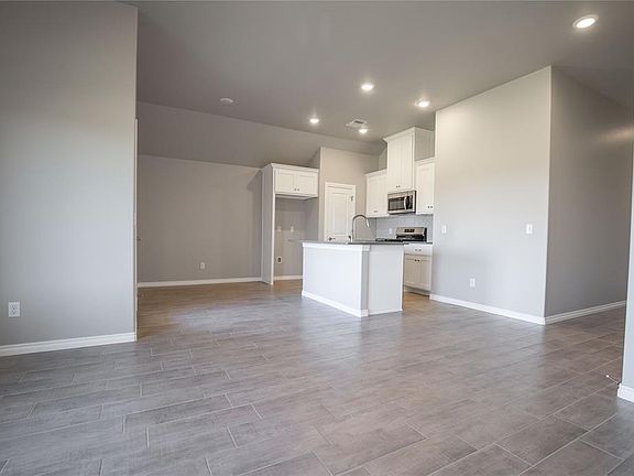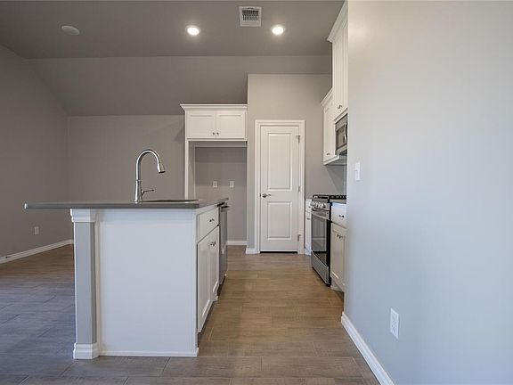 This John floor plan includes 1,310 Sqft of total living space, which includes 1,200 Sqft of indoor living space & 110 Sqft of outdoor living space. There is also a 385 Sqft, two car garage with a storm shelter installed. Home offers 3 beds, 2 baths, 2 covered patios, & a utility room! The living room includes high ceilings, exquisite wood-look tile, a ceiling fan, the perfect sized windows, & Cat6 wiring. The kitchen spotlights custom-built cabinets with decorative hardware, stainless-steel appliances, decorative tile backsplash, elegant countertops, & wood-look tile. The primary suite features 2 windows, a ceiling fan, our cozy carpet finish, & a sizeable walk-in closet. Attached is the primary bath, which holds a dual sink vanity complimented by a 3 CM quartz countertop, satin nickel features, & a walk-in shower with tile to the ceiling. Outdoor living includes fully sodded yards, a smart home irrigation system, & 30-yr weather wood shingles. Other amenities include a water-saving tankless water heater, a fresh air intake system, R-15 & R-38 insulation, & so much more!