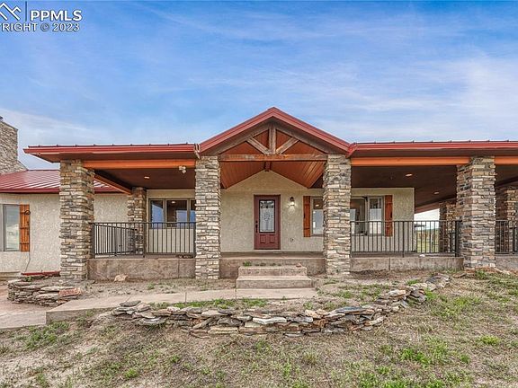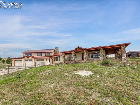 Imagine being able to sit on your front porch and watch the storms roll in over the entire Front Range. Enjoy Fireworks shows on the 4th of July from Denver to Pueblo without leaving your home. See amazing sunsets while feeling you are on top of the World. Welcome to your Castle on Top of the Hill sitting on 35 rolling, fully fenced acres with seasonal ponds. A Tile Entry leads you through to the kitchen, separate dining room and walk-in pantry with extra refrigerator for all your farm-fresh eggs. The kitchen has Knotty Alder Cabinets, double ovens, counter-bar and walks out to the side veranda and back patio. Off the entry, to the left, is a cozy library with Pecan Wood Floors and a built-in Bookcase. Down the hall you will find a Guest Bath, Recreation Room, and a mud room off the back patio. Step down to the Living Room complete with a stunning Stone Accent wall with Wood-burning Fireplace, stone Hearth and wooden mantel. Upstairs you will find three bedrooms, 2 baths and the conveniently located laundry. The Primary Suite has a walk-in closet and 5-piece bath with Jetted tub and a walk-in closet. The two additional bedrooms, one of which is double sized, share a full hall bath. The attached garage is 1900 square feet and is perfect for the car enthusiast or tradesperson. Built-in shelving and workbenches provide plenty of storage. There is a 5-stall barn (1632 sq ft) with water, electricity and an attached storage for your tractor. There is also an arena with water and a natural bowl that can be a great area for a shooting or archery range. Property is serviced by a Domestic Well Permit and allows for up to two dwellings. Starlink Satellite included. This property is ready for you to create your dreams of having a hobby farm, or organic garden. Easy Access to Judge Orr Rd or Hwy 24. Easy Commute to Schriever SFB.
