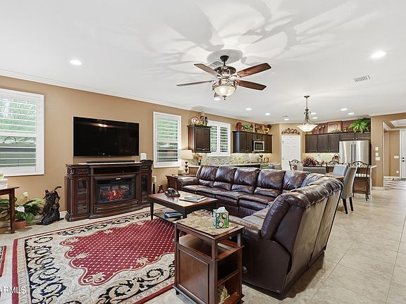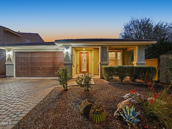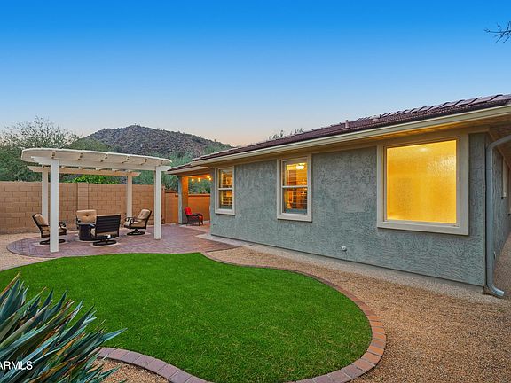 Open concept kitchen and dining area, features neutral fusion granite countertops and island, contrasting dark cabinets, linear glass mosaic tile backsplash, SS appliance package and a walk-in pantry for all your storage needs. Master suite with wood-look tile floors and classic wood shutters, full master bath features double sinks, a large walk-in shower, a soaking tub, and a spacious walk-in closet. Enjoy the outdoors and our beautiful weather, low-maintenance backyard with a covered patio, Pergola, artificial turf, and beautiful mountain views, wether you're waking up with a morning coffee on the front patio or relaxing for the evening in the backyard, there truly is nothing to do except move in and live your best life. Close proximity to 303 freeway access, 10 minutes to 85 acre Paloma Community Park, TSMC, shopping, dining, entertainment, health care, and less than 20 min. away from beautiful Lake Pleasant Regional Park. Floor plan and a list of features are available in the documents