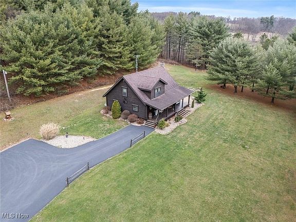 Kick back, relax, and enjoy the charm of this Jim Barna log home, perfectly blending privacy and convenience. Nestled on 9.7 acres of wooded land, this serene retreat is just moments from town. Featuring 2 bedrooms and 2 baths, the home offers a spacious, inviting great room with a stunning stone fireplace at its heart. The first floor includes a convenient laundry area, while the finished lower level provides additional living space ideal for relaxation or entertaining. Step outside to a beautiful covered front porch, the perfect place to unwind and take in the breathtaking views of the surrounding landscape. Whether you're sipping your morning coffee or enjoying a quiet evening, this tranquil space offers a scenic and welcoming atmosphere. An oversized patio to the side of the house adds even more room for outdoor dining, entertaining, or simply enjoying the fresh air. Together, these outdoor spaces create a seamless connection to nature and enhance the homes overall charm. The property also includes a 2-car detached garage and a 30x40 building/venue with a pavilion, ideal for hosting gatherings or events. Two running creeks meander through the property, further enhancing its peaceful ambiance. Updates include new flooring in 2023, a brand-new furnace in 2024, and a blacktop driveway that was repaved in 2020 and sealed in 2023. Currently used as a successful Airbnb, this property offers a rare opportunity for those seeking a private sanctuary with income potential. Sells turn-key with exception of a few personal possessions. AEP Electric average - House - $150 and Garage $30-month, Propane tank is leased with Hillside Propane. Owner gets 2 fills per year.