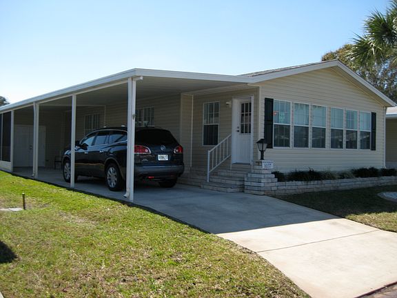 This 2BR 2BA split floor plan plus Den, 1392 SQ. FT. Home also has extended full Florida room with bamboo flooring just off the den which as laminate flooring, Living room open to dining room and kitchen with lots of storage, Laundry room with cabinets, Updated vanities, Master room large enough for king size bed. New stove, Extended storage shed with double door entry, Long carport perfect for 2 cars. Newer AC. A Must See.
