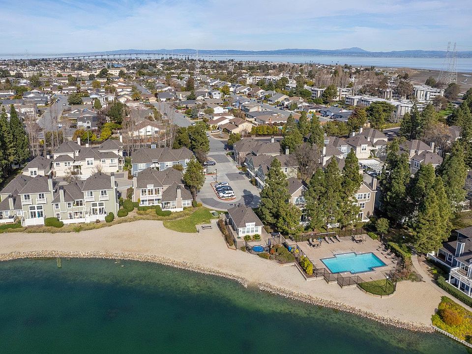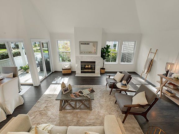 The perfect Townhouse for entertaining, located inside the prestigious Bayfront Court neighborhood. This two-bedroom, plus den/office, two and a half bath home has vaulted ceilings, a wonderful indoor-outdoor flow, and loads of light. At the heart of the residence is a spacious, open great room comprised of a living room with a wood burning fireplace and attached dining area both with engineered floors. Abundant windows look out over the lovely patio space, perfect for al fresco dining and parties under the stars! Upstairs you'll find the primary suite, 2nd bedroom, hall bath, and a 3rd room, perfect for work or play. Contemporary lines are complemented by refreshing views into the tranquil walking paths surrounding the home. Attached two-car garage with additional guest parking spaces nearby. Steps from the Association Pool, Spa, and Clubhouse with serene Lagoon Views. This home is assigned to the new Beach Park Elementary School (buyer to verify).