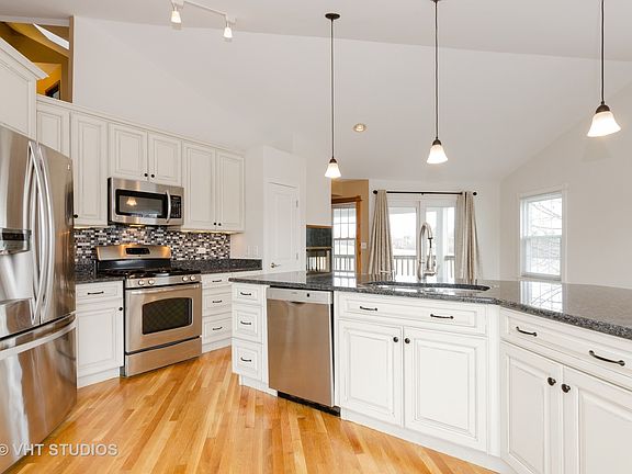 LIVE THE LIFESTYLE IN THIS MAINTENANCE FREE COMMUNITY ~SPACIOUS 3 BEDROOM, 2-1/2 BATH WITH UNFINISHED ENGLISH BASEMENT~UPDATED KITCHEN SHINES WITH THE GRANITE COUNTERS, FRESH PAINT, CUSTOM CABINETS & SS APPLIANCES, HARDWOOD FLOORS, TRACK LIGHTING & EATING AREA~FAMILY ROOM COULD BE A FORMAL DINING AREA~LIVING ROOM W/VAULTED CEILING, SKYLIGHTS, HARDWOOD & 3 SIDED FIREPLACE~1st FLOOR MASTER BEDROOM SUITE HAS HARDWOOD FLOORING, UPDATED WALK IN SHOWER, CUSTOM VANITY, HEATED FLOORING, WET BAR, FRIDGE, A CUSTOM WALK IN CLOSET, THIS MASTER HAS EXTRAS LIKE NO OTHER IN THE SUBDIVISION EVEN A SOUND PROOF WALL IN THE BEDROOM~2 BEDRMS UPSTAIRS SHARE A FULL BATH~FULL ENGLISH BASEMENT HAS A WORKSHOP AREA & POTENTIAL FOR A GREAT REC ROOM~2 CAR GARAGE~GOLF COURSE VIEWS~WALK TO CLUB HOUSE, POOL & GOLF COURSE~ CLOSE TO RESTAURANTS, SHOPPING & TOLLWAY~WONDERFUL HOME W/WONDERFUL UPDATES IN A GREAT LOCATION.