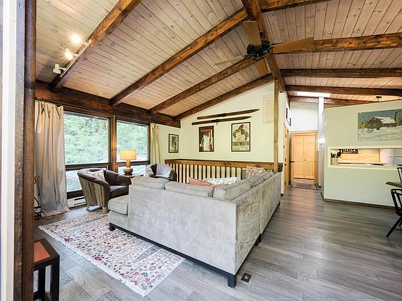 Quintessential Quechee property.... a 4 bedroom 2 bath contemporary home sited on a lightly wooded private corner lot. First floor has a Family Room with soapstone wood stove, huge bunk room, 2 bedrooms, upgraded 3/4 bath, and a Laundry/ storage room. The second floor level has a Great Room that opens to a wrap around deck., galley kitchen with access to the deck, a bedroom and updated bathroom complete the second level. A full basement and detached 2 car garage. This home comes completely furnished with the exception of personal items. This home is part of Quechee Lakes Association. Hiking trails, ski hill, golf, pickball, tennis, platform Tennis, restaurants, indoor and out door pools. An active community for all ages.