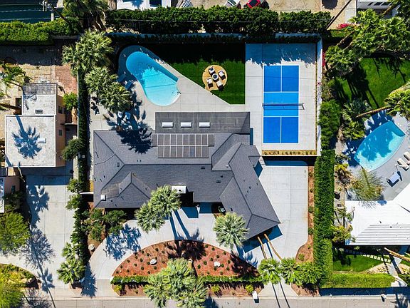Stunning Albert Frey Estate in Movie Colony East Ace Your Next Move: Own a Palm Springs Estate with Private Pickleball CourtWelcome to your Palm Springs dream retreat! This exceptional estate, originally designed by renowned architect Albert Frey, sits on an estate across from the South end of Ruth Hardy Park in the highly sought-after Movie Colony East neighborhood. Just minutes from downtown, this home seamlessly blends timeless design with modern luxury. Experience the ultimate entertainer's paradise in this completely redesigned interior, where sleek terrazzo flooring and an open-concept layout showcase the home's breathtaking mountain views. Sliding bi-fold doors create a seamless transition between indoor and outdoor living, leading to a resort-style backyard oasis with saltwater, a pebble-tech heated pool, and a cozy firepit lounge. Invite your friends over for a 'Dink'. on the newly added pickleball court--with a roll-away net for multi-purpose sports and events--offers endless possibilities for fun, while a circular driveway, privacy hedge, up lighting, and lush landscaping enhance the home's exclusive ambiance. Perfect for hosting unforgettable gatherings against the backdrop of stunning desert scenery! The chef's kitchen boasts a grand island, ZLINE Attainable Luxury Appliances wine fridge, double oven, gas stovetop with griddle, range hood, serving counter, soft-close cabinetry, generous island, dining area, and a spacious walk-in pantry. The separate dining room overlooks the pool, offering an elegant gathering space. The primary suite features a built-in beverage fridge and countertop, ideal for a coffee bar. The spa-inspired bathroom includes floating dual-sink vanities, a walk-in shower, a freestanding soaking tub, and a privacy window for soft natural light. A walk-in closet with a skylight adds to the suite's refined ambiance.**2023 Dual HVAC, **Solar Paid, and a New Roof This one-of-a-kind estate offers unparalleled design, privacy, and convenience--all in the heart of Palm Springs. Don't miss this rare opportunity!