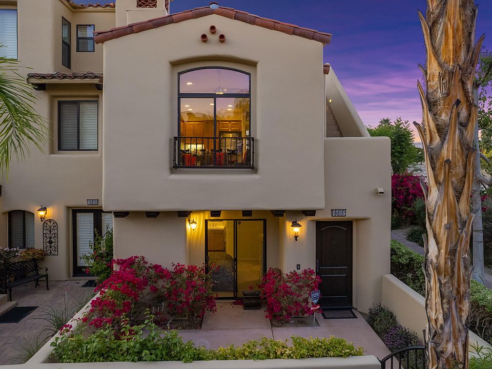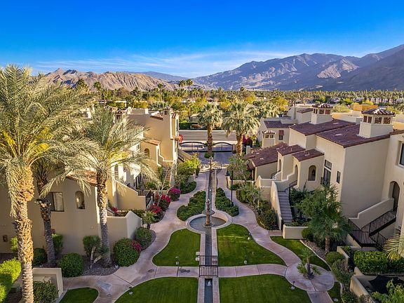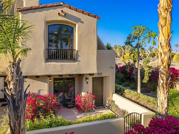 VILLORRIO is a bucolic lush Tuscan style community, in Palm Springs. This prestigious luxurious gated complex has it all: you OWN the land, centrally located, adjacent to downtown, no power lines, short distance to everything: trendy Downtown, shopping, parks, museums, galleries, hip bars, cafes, restaurants, Casino & Spa, golf, biking/hiking trails, a few minutes to the airport, etc. This unit has one of the PREMIUM lots: BEST LOCATION (quiet), SOUTH facing (year-round sun), END unit (more windows, natural light, quiet), PRIVATE (no unit across), LARGER private front patio than most units, + incredible views. This townhome has a desirable floorplan w/a Junior En-Suite Bedroom in the main level. Laundry is right off the spacious double car garage. Upstairs you find: the great room w/gas fireplace overlooking one of the 3 spas, trees and mountains; the dining area; an open floor kitchen. A spacious 2nd En-Suite Bedroom down the hallway w/plenty of closet space, plantation shutters and ceiling fan. The Bathroom is split so a portion is used as a powder room. The best of all, a very private roof deck w/fireplace, majestic views of the mountains + the Valley. This vibrant community has a very active social life, a large pool, 3 spas, fitness, clubhouse, BBQ, cobblestone streets, beautiful well maintained landscape w/tranquil stream, low density. This could be a very lucrative income property (minimum 30 days), a primary or a 2nd home. Low HOA: water, trash, roof, cable/internet.