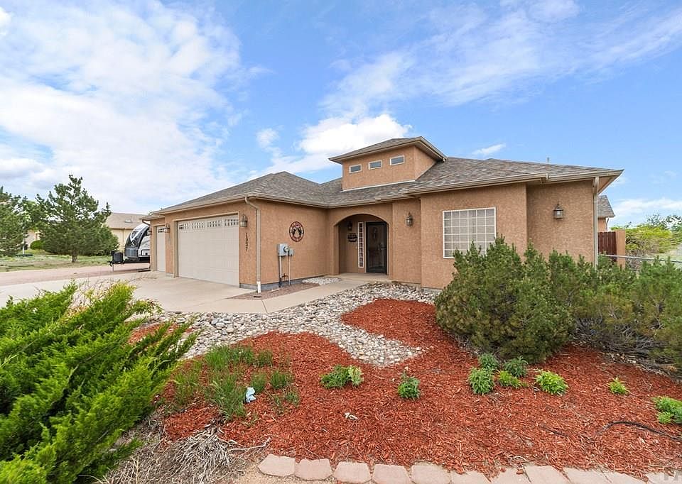 This beautiful three-bedroom, two-bathroom home on more than an acre is a must-see! The property features a truly unique floor plan designed for both comfort and functionality. Step from the covered front porch into an impressive entryway that opens to a warm and inviting living room. On one side, you'll find the spacious primary suite, complete with two walk-in closets, a luxurious five-piece ensuite bathroom featuring a jet tub and walk-in shower, and a sliding door leading to the private courtyard with a hot tub. On the opposite side of the living room, a convenient pocket door leads to the mudroom/laundry area and the spacious garage. Down the hallway, there's a full guest bathroom and two additional well-sized bedrooms, each with generous closet space. The expansive dining area includes an elegant electric fireplace and offers plenty of room for entertaining or can easily be divided to create a family room, game room, or office space to suit your lifestyle. The kitchen boasts abundant counter space, extensive cabinetry, a glass cooktop, built-in oven and microwave, and not one but two pantries for maximum storage. Outside, the fully fenced backyard is ready for horses and includes a lean to shed and chicken coop. An additional 12x24 shed provides excellent space for a workshop or extra storage. Enjoy breathtaking mountain views and the convenience of being close to Lake Pueblo. Don't miss your chance to see this exceptional property, offering space, comfort, and charm.