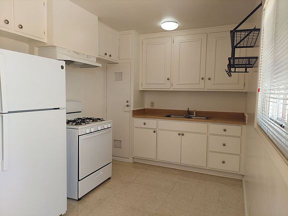 2 Bedroom, 1 Bath unit Open living room area. Small kitchen with fridge, stove and hood vent. Ceiling fans in bedrooms Carpet in bedrooms and living room Tile in kitchen and bathrooms Detached garage Heater/Cooler Refrigerator provided but not warrantied Owner pays for water and trash service Gas Stove