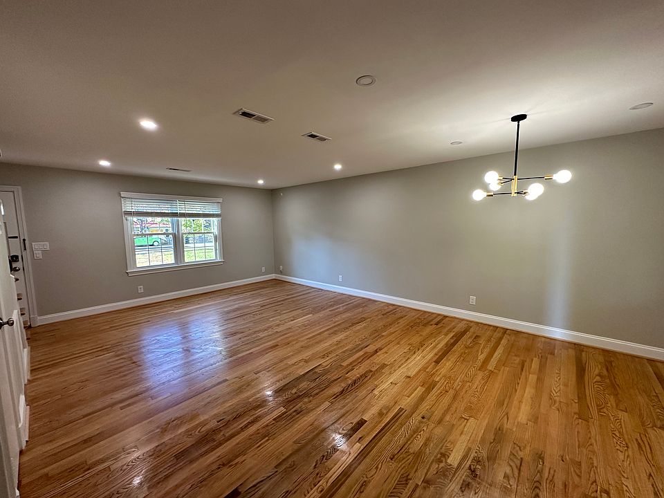 Renovated duplex in desirable North Downtown. Refinished hardwood floors throughout. Freshly painted. Kitchen with wooden shaker cabinets, stainless steel appliances, granite countertops, dishwasher, electric oven/range with glass top, microwave/hood combo, fridge, delta faucet. Living room, dining room, and kitchen are one open living space with stylish half bathroom on the first floor. Second floor features two bedrooms and hall bathroom. Hall bath with double vanity, tile floor, and tile tub/shower surround. Large bedroom (can fit a king bed) with ample closets, second bedroom would make a great guest room and/or office space. Screened in back porch. Off street parking. Central heating and air. Nice backyard (shared). Washer and dryer in unfinished basement with additional storage. Access to the basement is from the exterior making for easy load in for bikes or other storage needs.