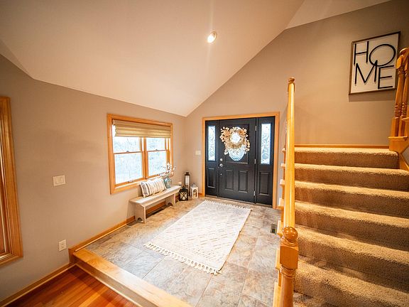 This truly unique custom-designed home offers exceptional features and thoughtful details throughout. The main floor boasts a spacious living room with soaring vaulted ceilings and a cozy fireplace—perfect for entertaining family and friends. The chef’s kitchen is equipped with stone countertops, a large island, a gas cooktop, a double oven, a walk-in pantry, pots and pans drawers, a built-in bureau, a breakfast bar, and twin patio doors leading to the deck and backyard. A pocket door connects to the main-floor laundry and mudroom, complete with central VAC for added convenience.