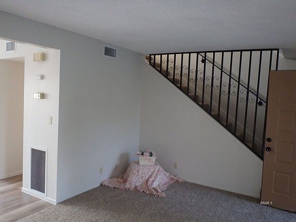 New carpet in living rm, stairs and two bedrooms! Downstairs new vinyl planking in guest bath, dining area w/fan, and kitchen. Fresh paint thruout. Downstairs 1/2 bath has new vanity.Kitchen has white cabinets, tiled counters, and laundry connections. Slider opens to personal patio w/small planting area. New water heater in corner. Door to spacious garage with new opener. Black wrought iron railings line the staircase to second level. Upstairs are two bedrooms w/new carpet: master has two closets. Upstairs bathroom has new toilet, faucet ,and mirror; vinyl planking floor. Linen storage cabinet. Fenced association pool right across from front door