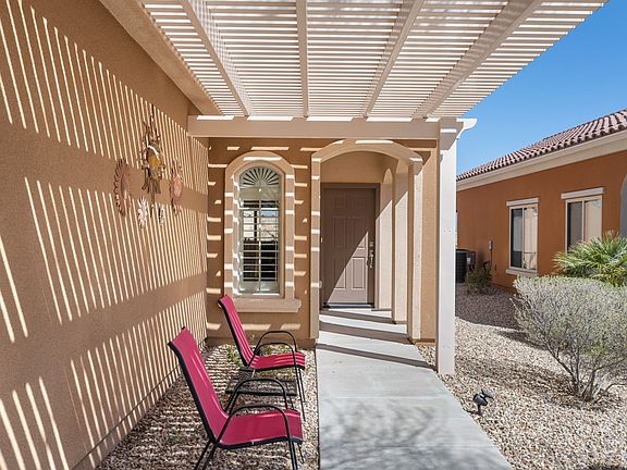1038 Sundial Lane is a beautiful 3-bedroom, 2-bathroom home with stunning views of the valley and mountains. The property is located in a peaceful and serene neighborhood, offering a perfect blend of comfort and privacy. The house features a spacious living room with large windows that allow natural light to flow in, creating a warm and inviting atmosphere. The kitchen is fully equipped with modern appliances and ample counter space and the bedrooms are cozy and comfortable, with large closets and plenty of storage space. The outdoor area features a large, fenced in backyard, extended paver patio with synthetic grass and an extended pergola patio with privacy walls and a patio area that offers breathtaking views of the valley and mountains that will captivate just captivate you. Need a furniture package? No problem, owners are will to sell the home furnished which could also include your own personal golf cart!