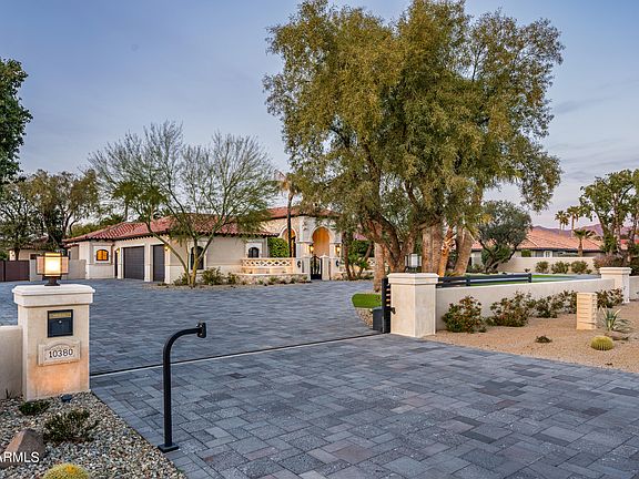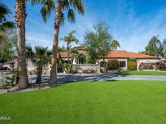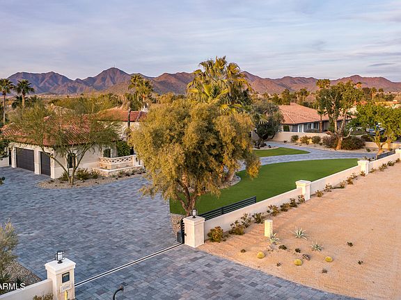 Timeless Spanish inspired estate in the heart of Scottsdale, completely renovated and customized with quality finishes throughout. Upon entering a private gated entry with a circular drive of stone pavers, new landscaping, limestone fountains and a lush private courtyard provide a warm welcome for guests. The main house is sophisticated and elegant with intricate ceiling detail, steel glass window and door systems that provide ample natural light throughout. All single level living includes formal dining room with temperature-controlled wine wall, gourmet kitchen featuring custom cabinetry and center island, great room and office with limestone fireplace centerpiece. The comfortable primary suite features dual closets and bathrooms with decorative counter tops, mirrors and backsplash Three spacious ensuite guestrooms are split from the primary suite and offer unique interior design touches for guests. A private, detached 3-bedroom guesthouse has the charm of a classic Arizona retreat with a modern Spanish flair featuring a full kitchen, spacious living room and full-size laundry room. Oversized, climate controlled 3-car garage with built in storage, new epoxy floors and LED lighting. Situated on 1.15-acres, the stunning grounds offer resort-style amenities with pool, spa, water and fire features, expansive turf areas, mature trees and vegetation, a lighted sports court, generous covered outdoor living spaces, and BBQ center with bar seating and trellis cover. This property is a one-of-a-kind offering, a rare combination of privacy, views, current interior styling and expansive grounds just minutes to shopping, dining and the Loop 101.
