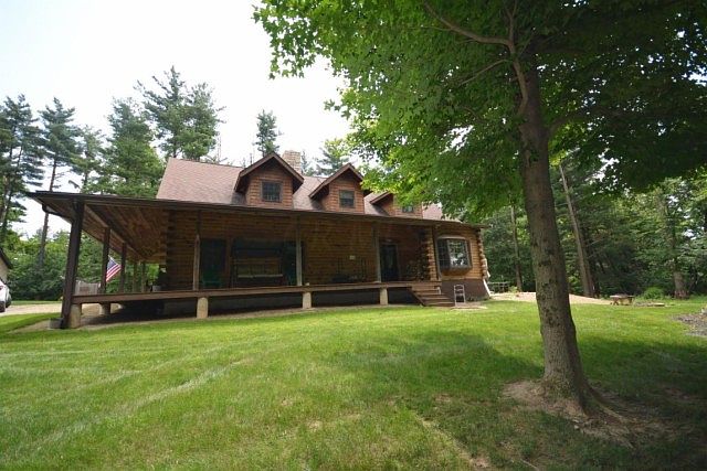 Spectacular log home nestled on 2 acres of seclusion. Wrap around porch on three sides, 28 x 32 (3) car garage. Spacious, unique layout is loaded with amenities. Walls of closet space, hidden storage, full walk-out basement. Gourmet kitchen offers granite, ceramic tile, walls of cabinetry including pantry cabinet & more. Some Wood flooring, exposed wood beams, great room offers woodburning fireplace, first floor owner's bedroom, Upper level offers 3 additional spacious bedrooms with walls of closets as well as multiple walk-in closets. Mature trees and wooded views from every window. Kitchen with ceramic tile flooring, wood in great room. Exterior water feature, circular drive. Rare opportunity on a magnificent serene setting. Easy access to Rt 3 for easy commute as well as town.